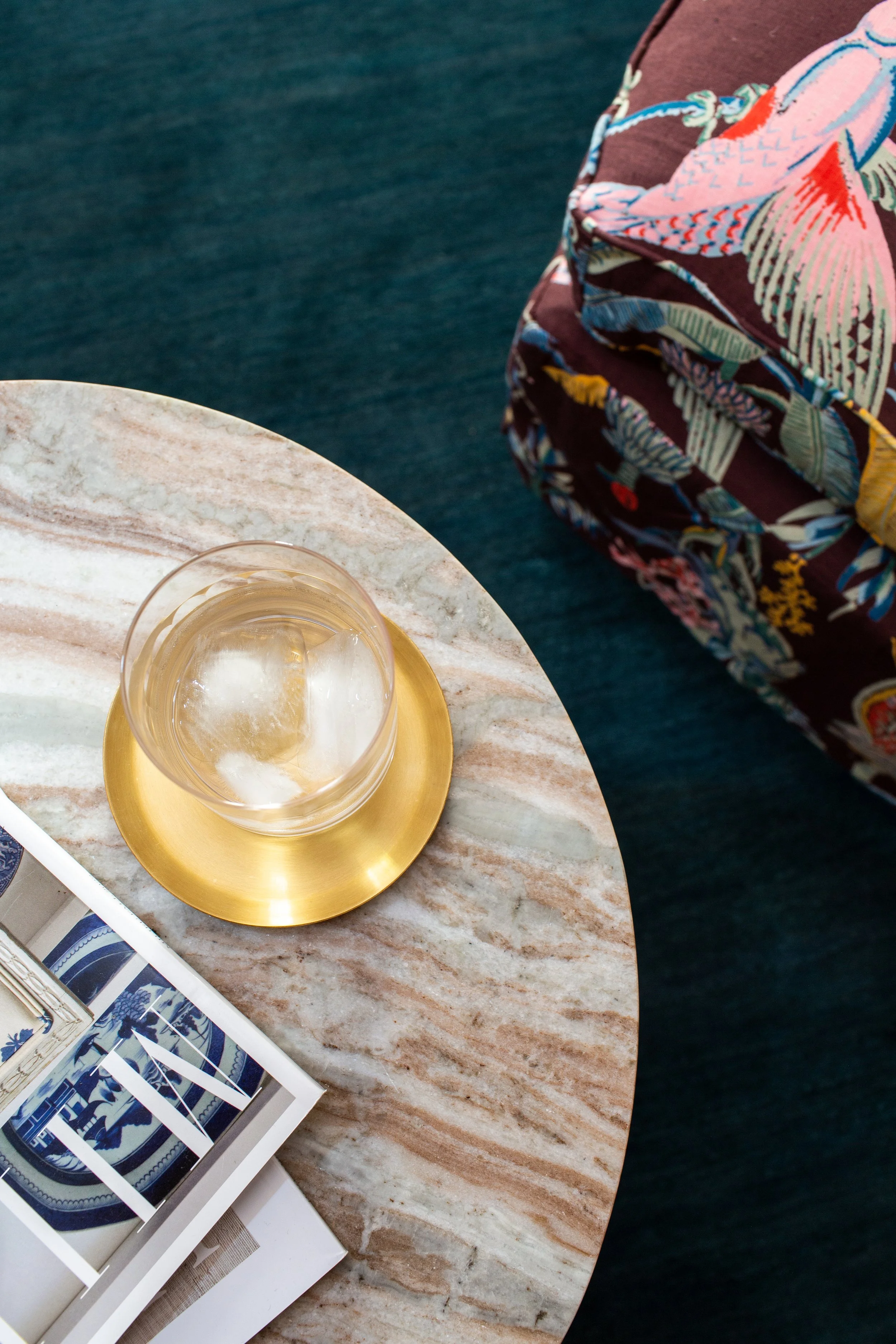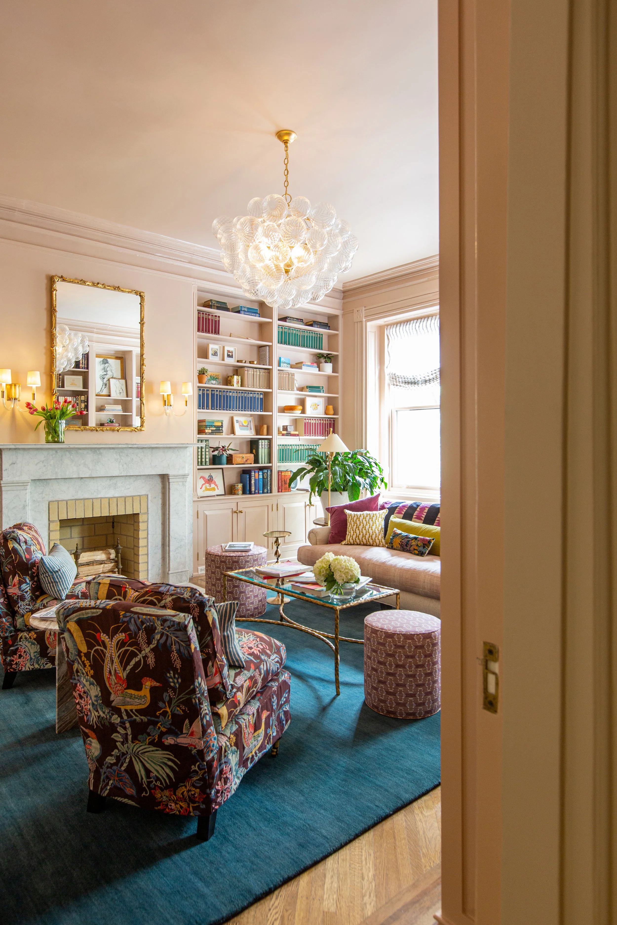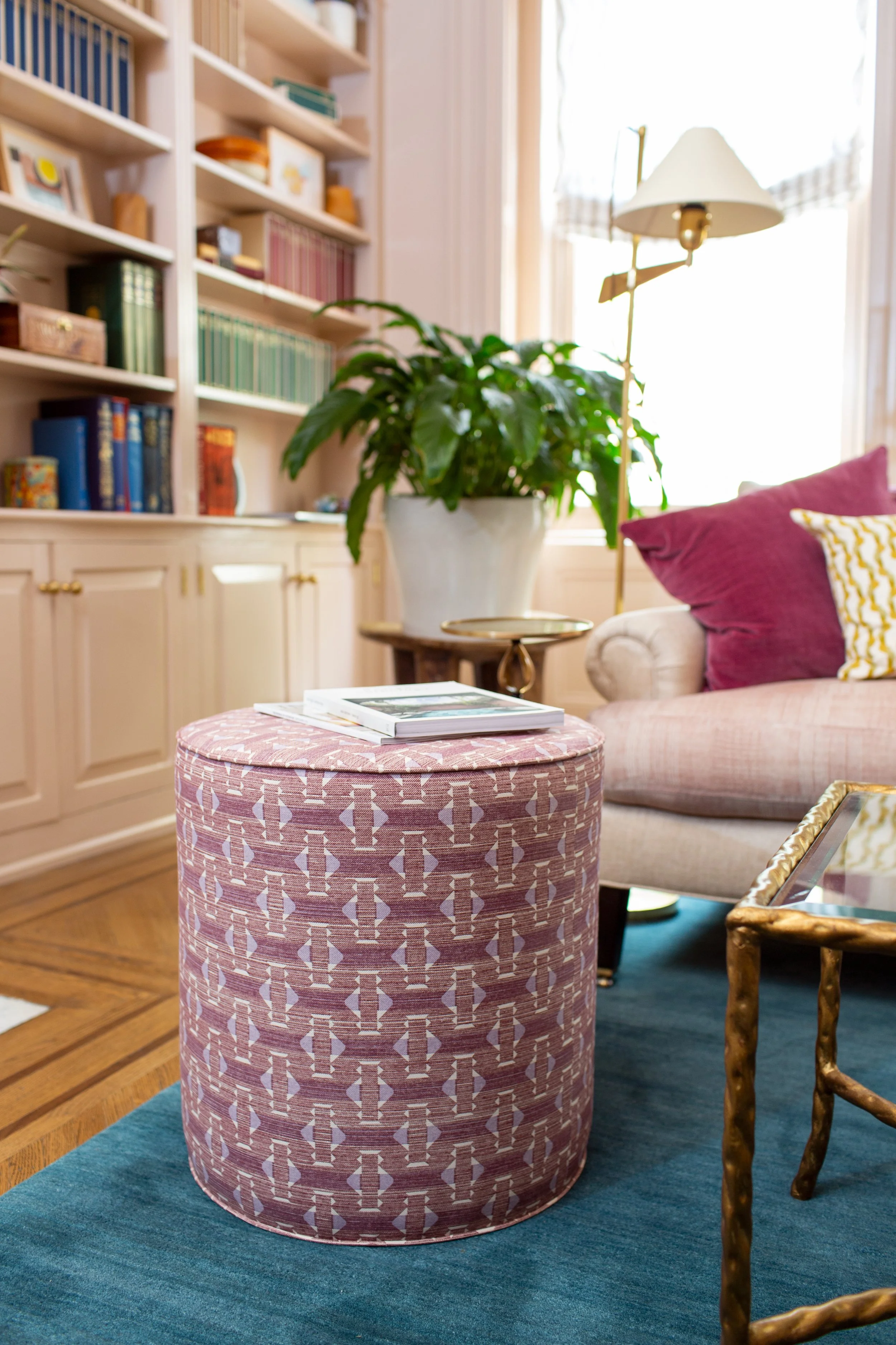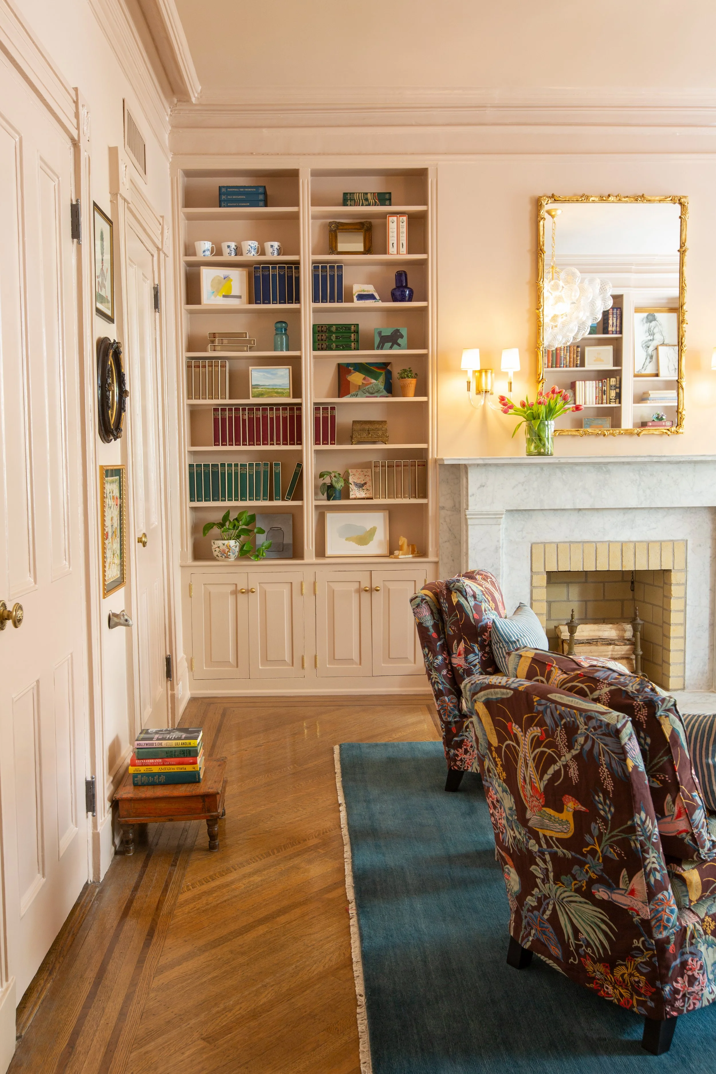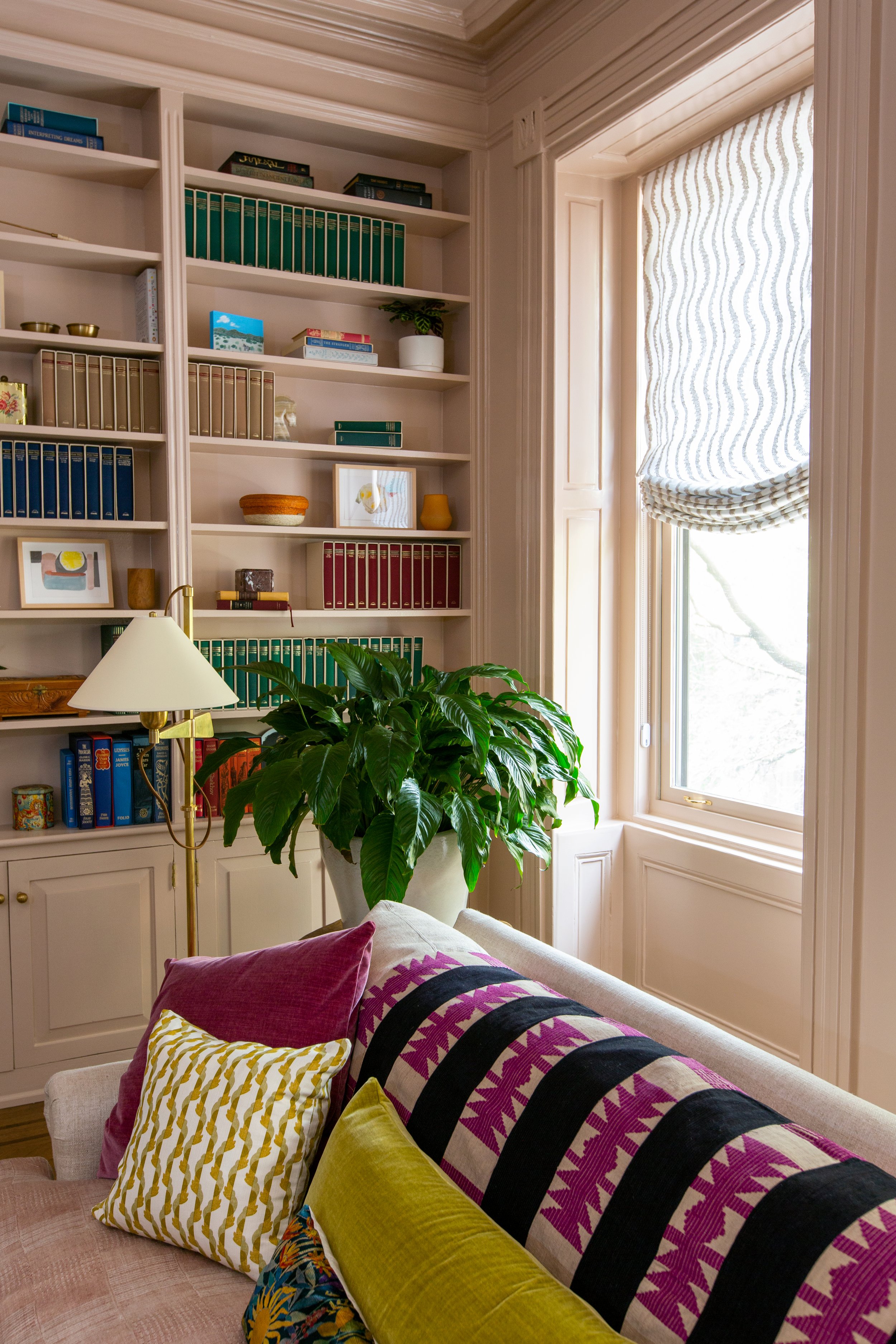 "Known for its buoyant mix of color and pattern, local home decor shop Collyer’s Mansion called upon its well-curated lineup of artisans to decorate the library, which was warmly enveloped in a Sherwin-Williams soft pink. Patterns from Jennifer Shorto Textiles, Rebecca Atwood, and Walter G coalesce within the interior. The key to tying it all together? That Utopia Goods Paradise Cocoa fabric featured on the slipcovered chairs — it’s “what we like to call a ‘bridge’ fabric, and it really defined the palette for us.” - ADPro